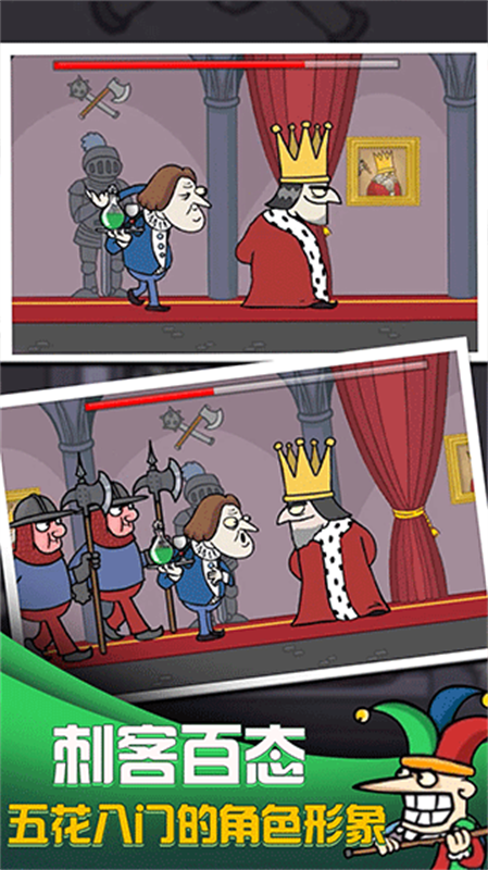 我要当国王2是趣味十足的休闲游戏《我要当国王》的第二部作品,本作在上一部作品的基础上添加了更多可操作的角色,每位角色皆有不同的刺杀手段,更有多种趣味剧情将带给玩家相较于第一部作品更为欢乐的体验。在我要当国王2中,玩家将扮演一位意图夺取王位的刺客,在国王的身后神不知鬼不觉地刺杀国王,并避免被发现或者刺杀失败而陷入牢狱之灾,当玩家刺杀成功并登上王位后,玩家将迎接无止境的刺杀,这时需要玩家抓住时机,躲避刺客的攻击并将刺客绳之以法,以坐实自己的王位,对休闲类游戏感兴趣的话,既快快下载我要当国王2体验吧!
