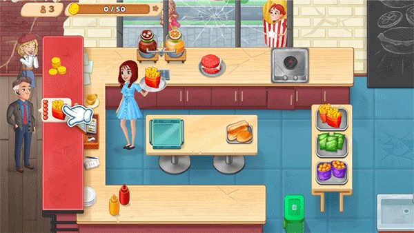 卡通画风里的菜品栩栩如生,上百种食谱从汉堡到法甜随心做,超多的操作手法考验玩家们的手速,不断的提升自己的实力和菜谱品种,按照顾客的需求来进行制作,获得全部的奖励,赢得游戏的胜利。