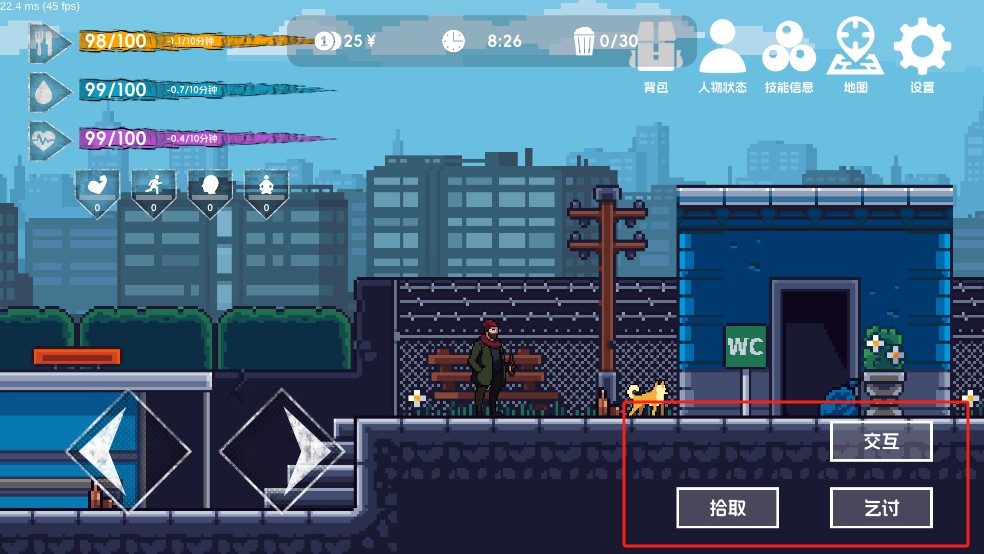流浪者2是一款像素风格的模拟游戏,玩家们将成为一名流浪汉,在这个充满挑战的城市中生存下去,操控流浪汉完成各种的任务,保证自己能够生存下去,游戏内有着完善的生存系统,玩家们可以看到自己的各项指数,保证自己能够安全的生存下去,这里有着不同的工作可以进行尝试,每一项工作都会固定消耗时间,提升自己的各项属性才能够在这座城市中生存下去。