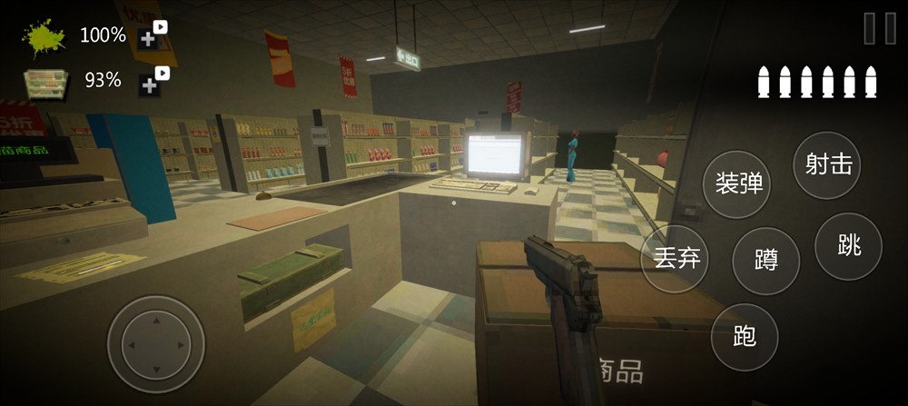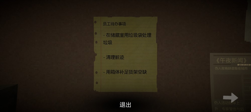 3、恐怖超市模拟器手机版游戏以深夜超市为背景,场景内灯光昏暗,背景音乐为低沉的环境音,货架间的阴影区域会随时间推移扩大。