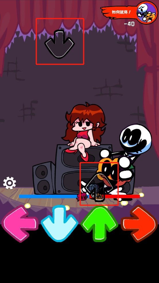 4、下面图中与下方固定箭头颜色一致的箭头下落时才是玩家的节奏部分,玩家需要等下落箭头与下方固定箭头重合时点击才会得分,否则早点或者晚点是不会加分的。