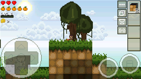 屏幕左下角是控制移动的虚拟摇杆,进行移动,向前探险,右下角的A是跳跃,两次就是两段跳。B是攻击键。途中会通过跳跃、潜水、挖掘来保护自己。