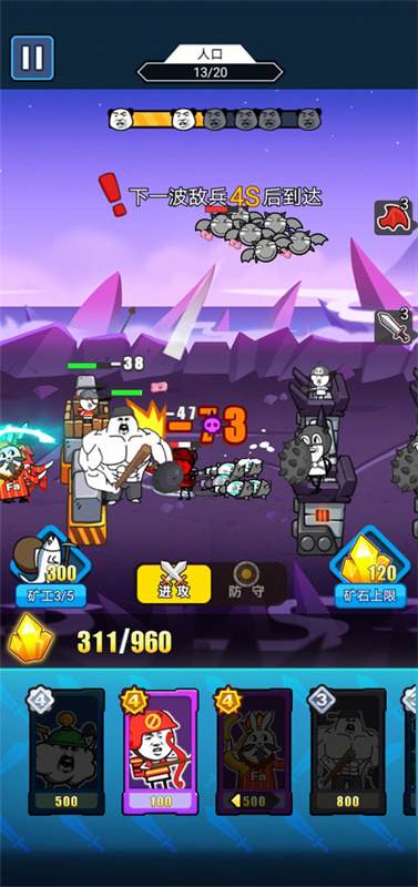 咸鱼矿工正在采矿,收集来的矿石,可用于生产兵力。类似的游戏推荐《火柴人战争遗产》也是同样的操作,所不同的点在于游戏画风的滑稽幽默画风,借由网络流行用语的表情包搭配,显得整体画风特别的诙谐。同时,游戏玩法也是延续经典的策略塔防体制,通过咸鱼矿工的采矿进度来收集资源,生产士兵。