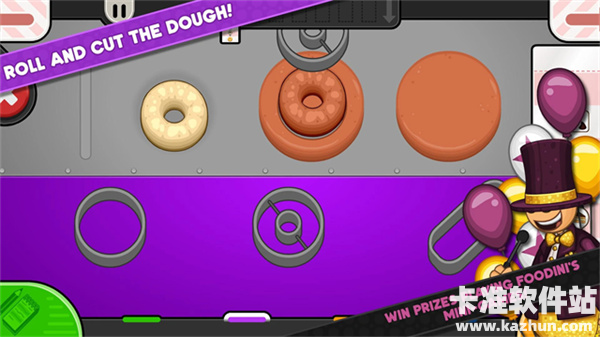 2、第一个操作间是生面团站,甜甜圈需要一个有特殊形状的生面团,玩家需要选择一个面团将其放置在工作区域。用擀面杖将其平摊成一个圆形的面饼后,借助模具来完成造型
