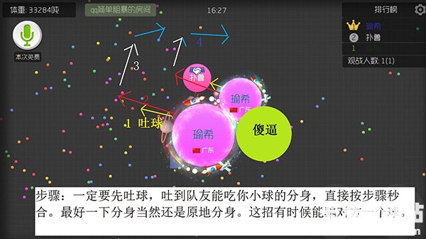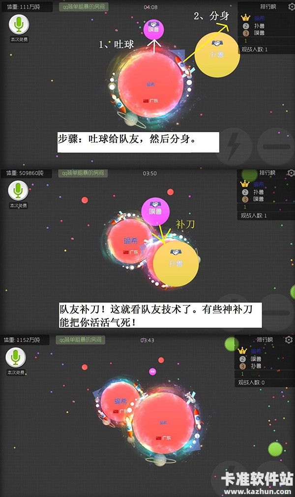 1、有一种情况是这样,你没有把握分身后能不能吃掉对手。这时候你吐给队友一个稍微大的球,然后再分身,分完后,队友补刀。这招团战也经常见到,而且屡试不爽。