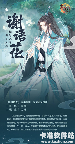 角色经历:身为谢府嫡子,谢语花出身尊贵自幼背负家族兴衰荣辱,即便如此,他对凤离怀有不掺任何杂质的爱慕。他深情却又内敛,在凤离需要时,可不顾性命为凤离牺牲。但因彼此的身份,谢语花注定无法与凤离一生一世一双人,所以他宁愿隐藏自己的心意,陪在凤离身边,默默付出,但这份感情又能够迎来拨云见日的一天吗?