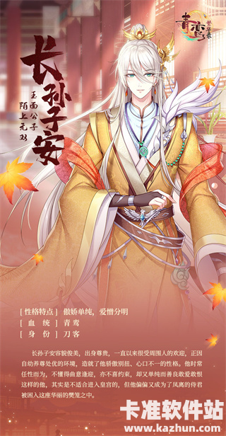 角色经历:长孙子安容貌俊美,出身尊贵,一直以来很受周围人的欢迎,正因自幼养尊处优的环境,造就了他骄傲别扭、心口不一的性格。他时常任性而为,不懂得曲意逢迎,亦不喜约束,却又单纯而善良、敢爱敢恨。这样的他其实是不适合进入皇宫的,但他偏偏又成为了凤离的侍君,被困入这座华丽的樊笼之中。