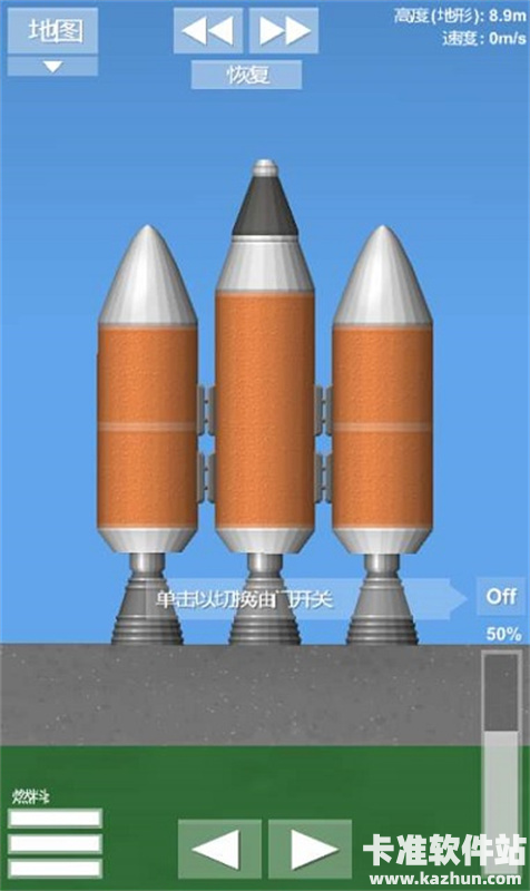 这个火箭是比较简单的火箭样式,里面搭载了一个小型的卫星,超长的燃料箱以及两个辅助的燃料箱提供更多的燃料补给