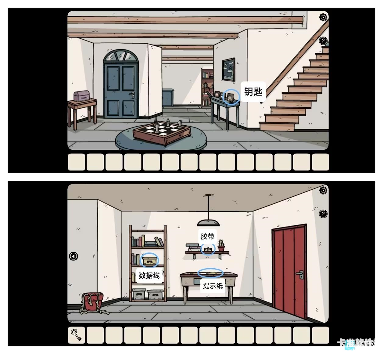 1、拿走相框背后的「生锈的钥匙」,再到二楼右侧拿走「数据线」、「胶带」以及「提示纸」