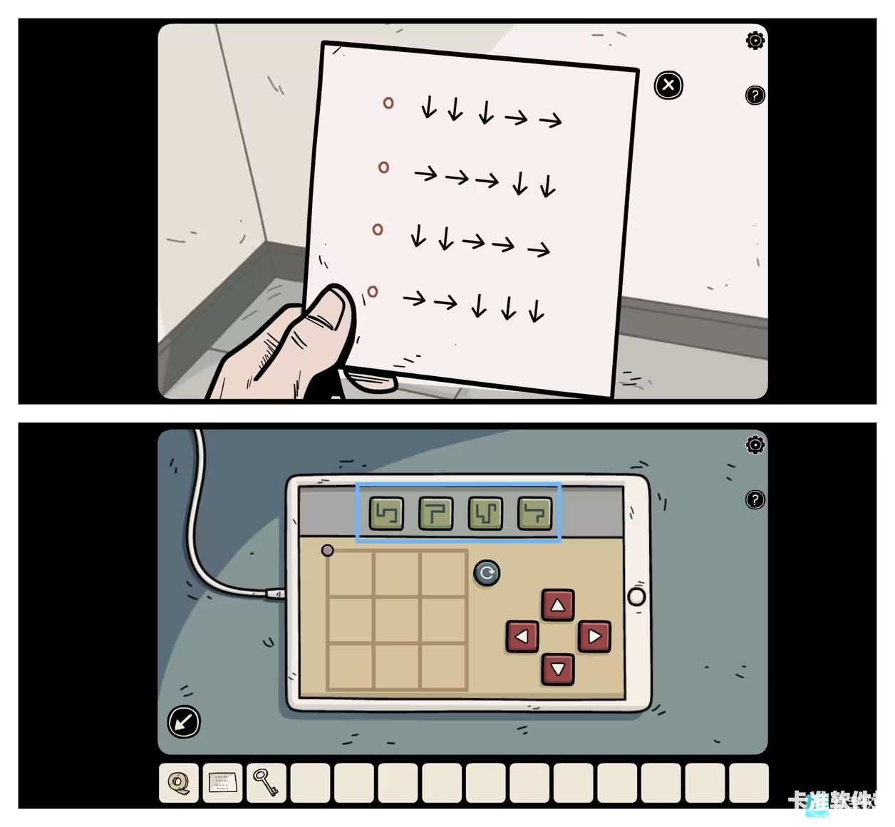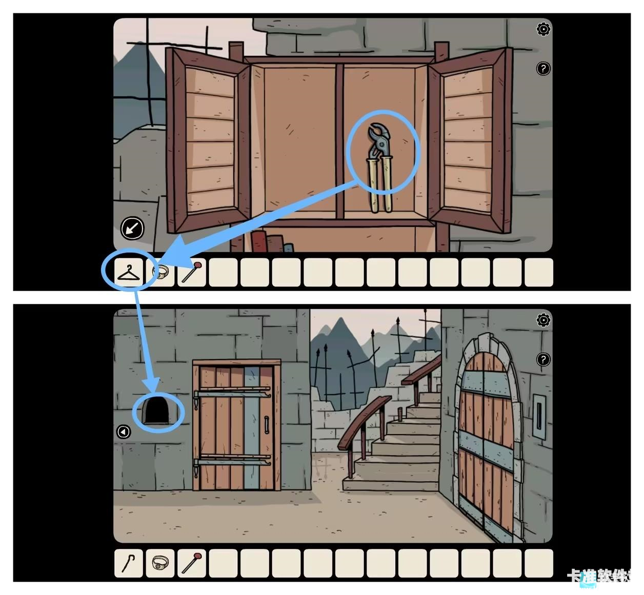 3、回到地道口,根据符号密码打开右侧的柜子拿到道具「断线钳」,再和衣架组合成「钩子」打开右边第一道门(如上图)。