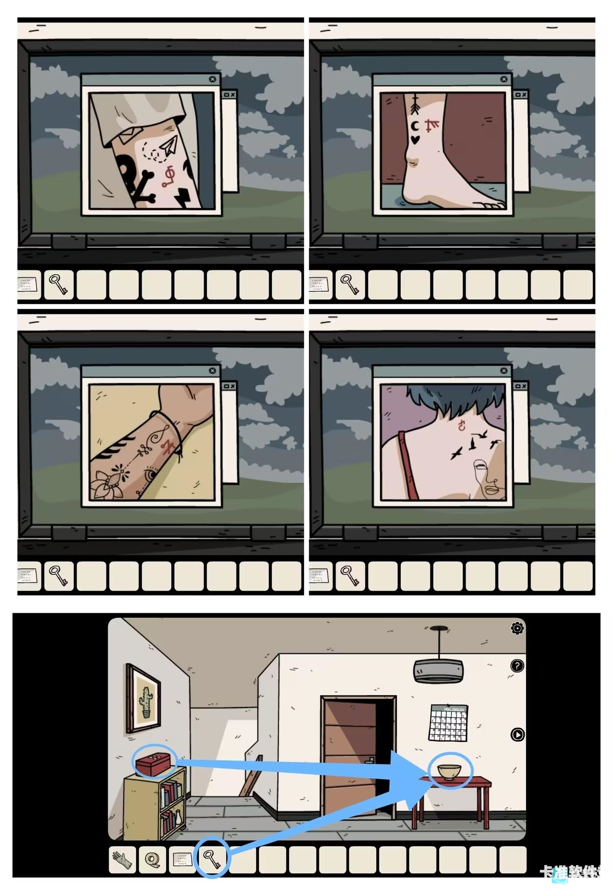 9、用钥匙打开右侧的棕色门,进入房间拿走左侧柜子上的「皮包」,再观察窗外四个小黑固定的行走路线获得图形密码(如上图)。