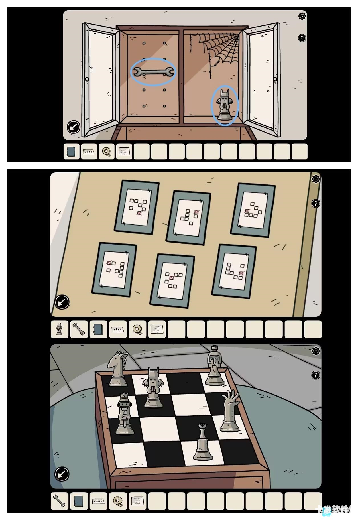 7、输入符号打开书柜拿到「扳手」和「棋子」,再观察留言板上的卡片(注意每个棋子对应的位置),接着将棋盘棋子放置正确的位置(如上图)获得「电池」