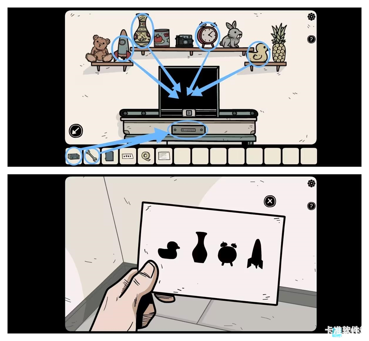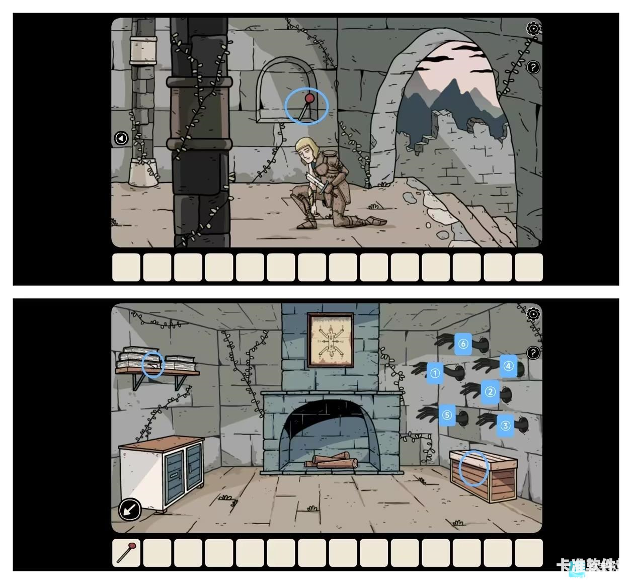 1、从地道出来先往左走拿到「杠杆」,再进入蓝色门房间,按顺序(如上图)点击右侧的黑手打开箱子拿到里面的「戒指」与「旧钥匙」。
