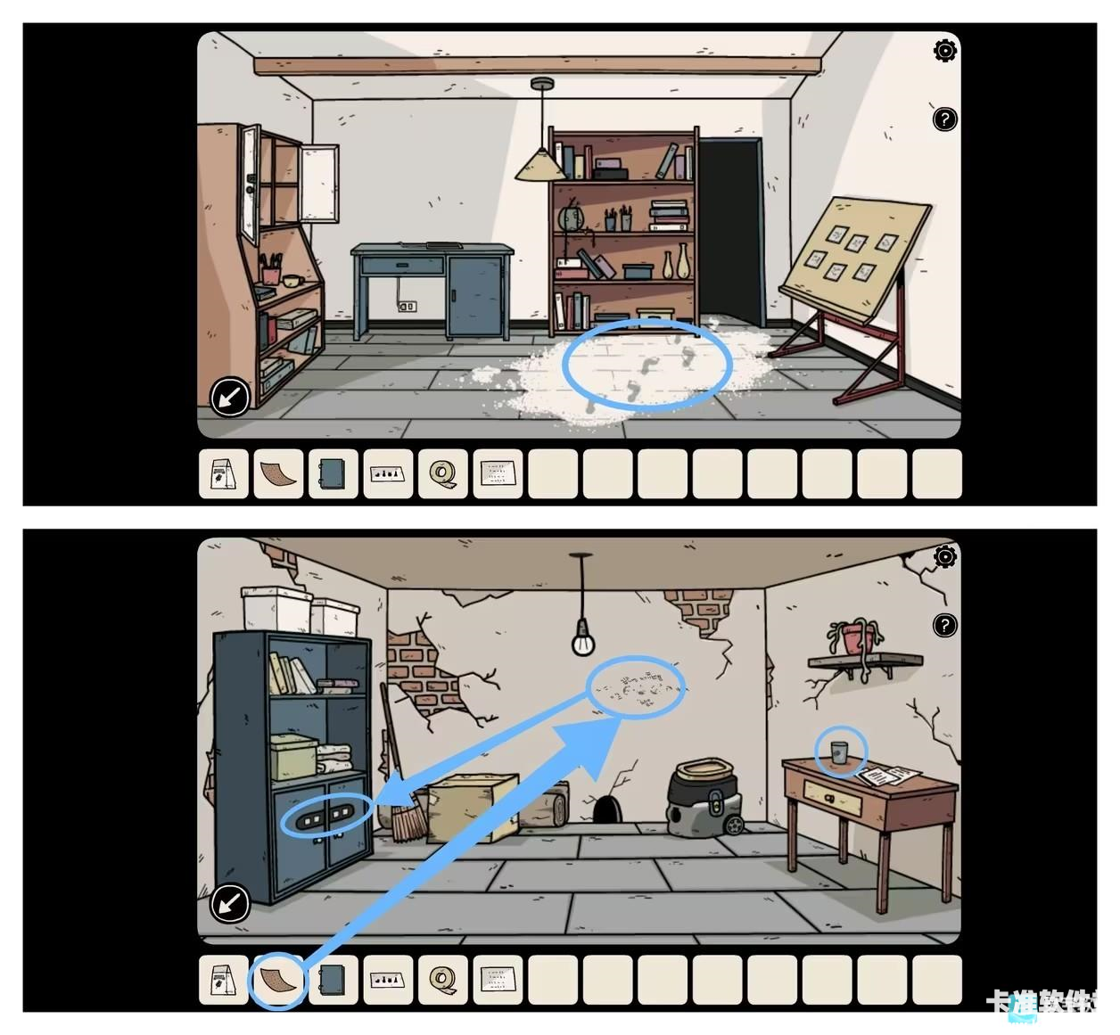 9、来到客厅触发剧情进入暗室,用砂纸清理墙壁上灰尘获得四个「图形密码」,接着打开左边的柜子拿到「毛刷」和「美工刀」