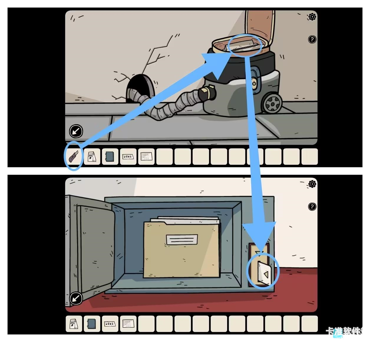 11、回到暗室将软管装在吸尘器上打开开关,再用美工刀割开袋子拿到「磁卡」,接着回二楼右侧房间用其打开保险柜,点击文件夹进入剧情