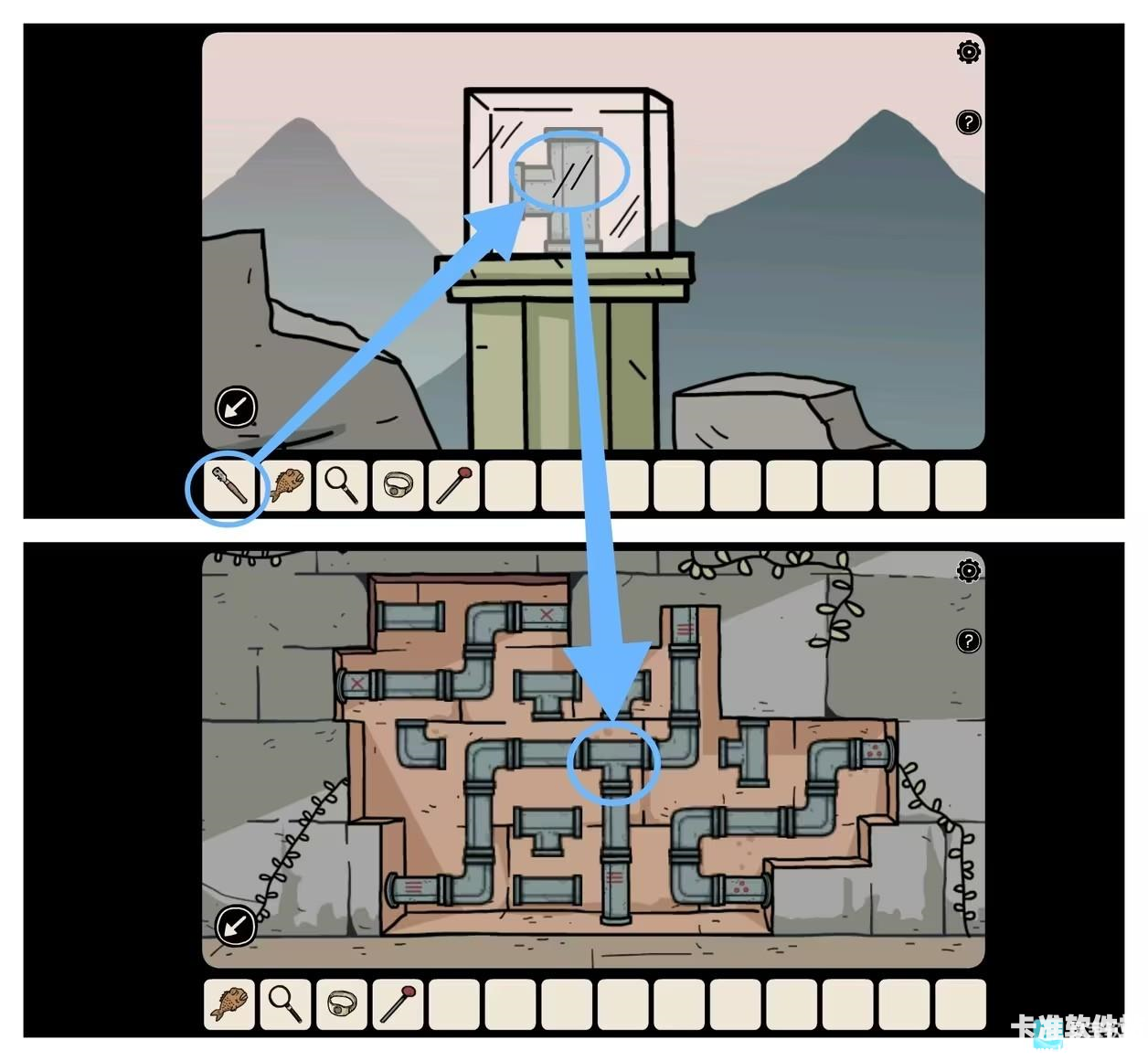 7、来到山顶用切割机划破玻璃拿到「水管」,再来到房间完成水管连接(如上图),接着将杠杆安在喷泉机关上并激活后将鱼放入水中获得「钥匙」。