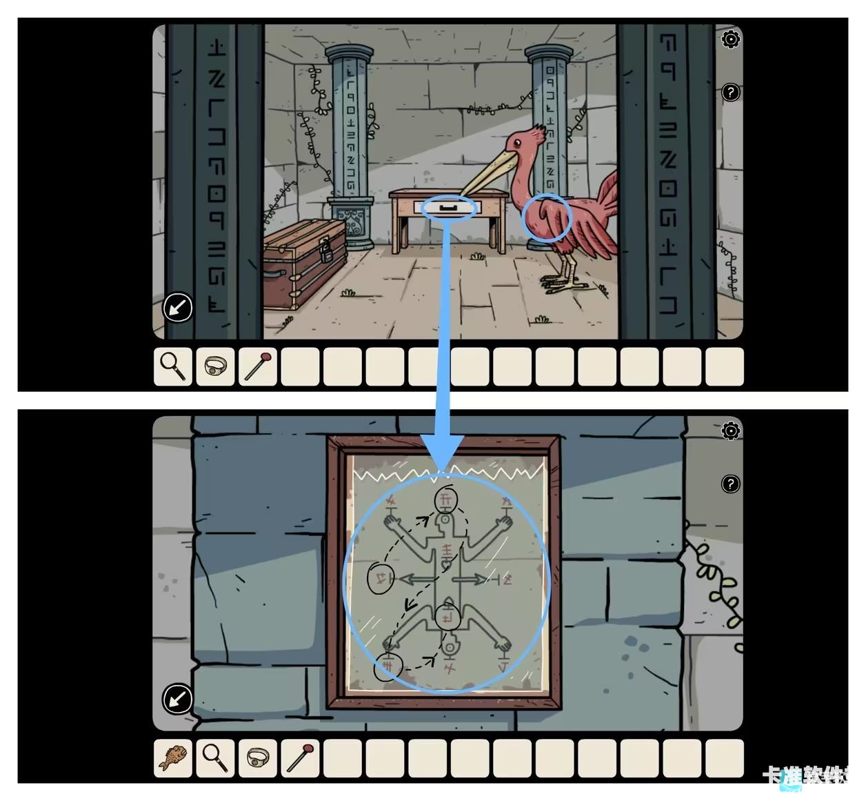 11、将沙子放入山顶树洞的沙漏中,再用放大镜观察获得四个「符号密码」,然后到棕色房间打开箱子获得「鸟食」,接着到二楼红色房间将其喂给怪鸟获得「鸟蛋」和另外四个「符号密码」。
