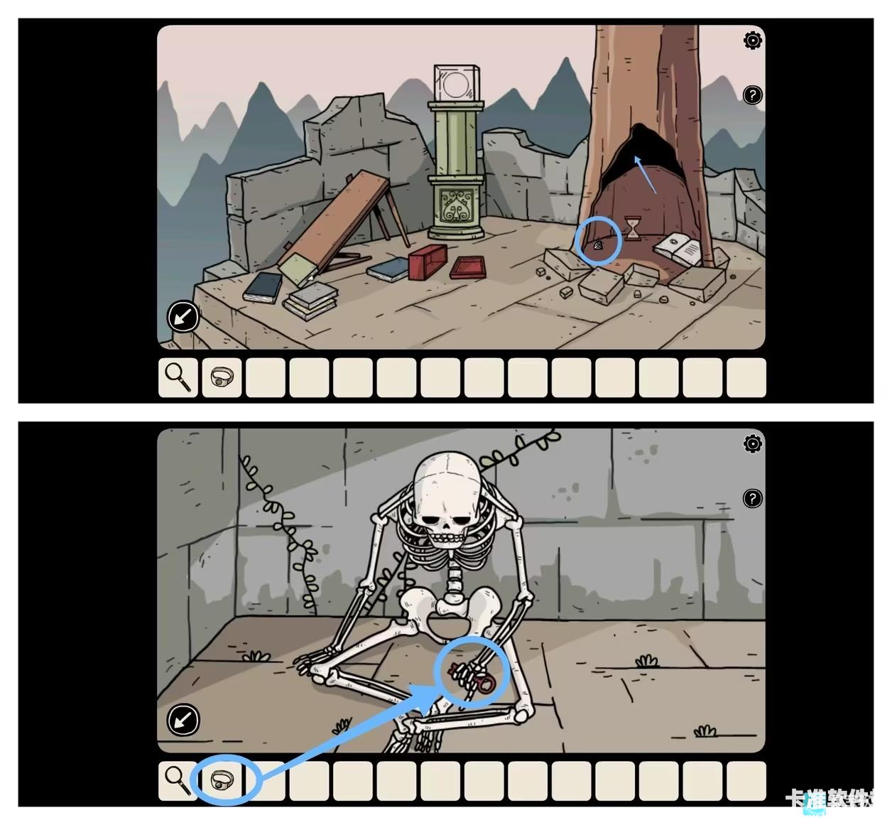 8、到山顶用钥匙打开树洞拿到「钻石」,再与戒指组合,之后到神庙的楼梯间与骷髅兑换「钥匙」。