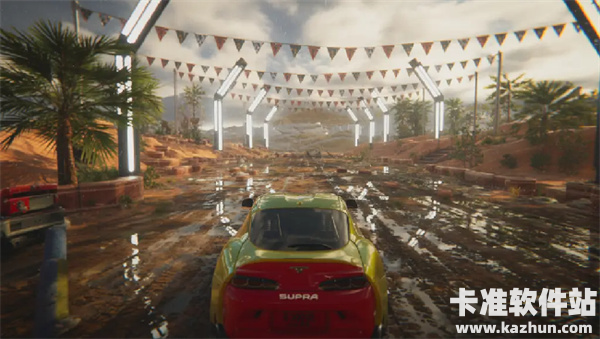 游戏采用定制化物理引擎,精准模拟Supra MK4在不同地形下的动态表现:泥浆飞溅的反弹效果、岩石路面的颠簸震感、水花四溅的真实场景,甚至轮胎打滑时的细微车身倾斜,都让玩家仿佛置身真实越野现场。