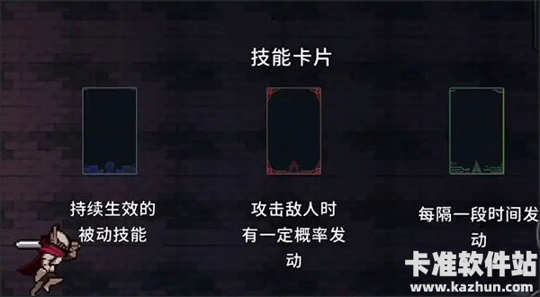 技能系统主要包含:主要技能(红色卡)、辅助技能(绿色卡)、增益技能(蓝色卡)