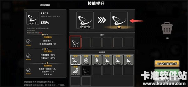 玩到后期,得到的技能卡越来越多,一些用不上的技能卡可以通过‘+’进入技能升级强化界面,给需要升级的卡投喂‘狗粮’。