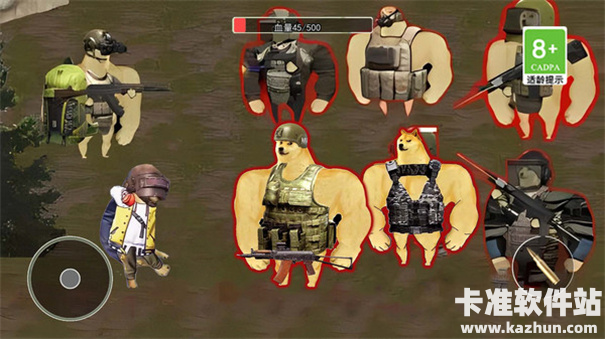 柴犬主角手持加特林、火箭筒等重武器,搭配毛绒特效和Q版爆炸云,缓解战斗紧张感。