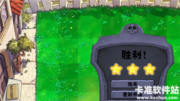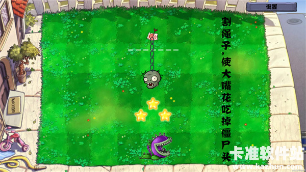 2、第一关比较简单,横着划掉锁链垂直掉落至吃人花,将僵尸消灭掉,顺便获得三颗星星。通关成功!