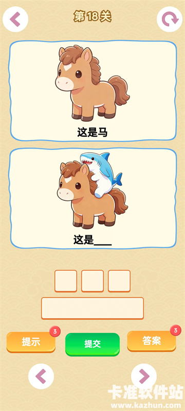 谐音梗游戏简单易懂的游戏玩法十分富有乐趣,同时也让玩家可以快速上手进行体验,感受在一道道谐音梗关卡挑战中开动脑筋急转弯思考出答案的成就感以及得到答案以后收获的乐趣。