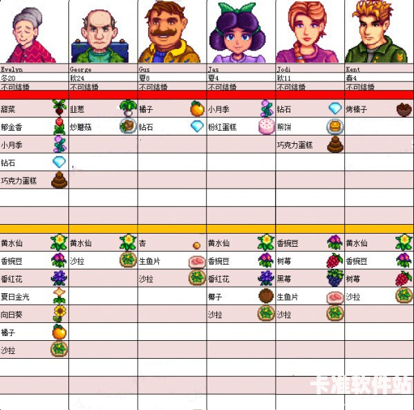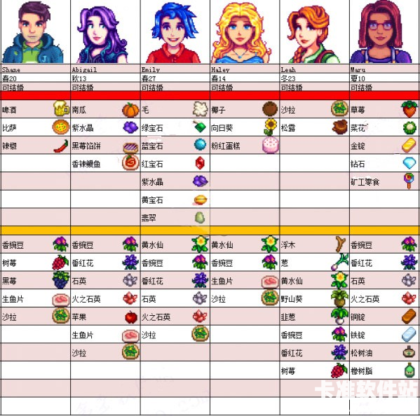 4、阿比盖尔:是一个叛逆性的女孩,最喜欢器材碎片、兔子的脚、黑莓馅饼、巧克力蛋糕、河豚、紫水晶、南瓜,喜欢所有宝石、料理、工业品、花、不喜欢所有的鱼、手工艺品、矿产、建筑材料等,讨厌所有的蛋、垃圾、鱼饵、牙签、海藻等。