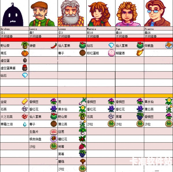 3、哈维,小镇里的医生,梦想当飞行员,但是恐高,最喜欢能量餐、龙虾浓汤、松露油、幸运兔脚、咖啡,喜欢所有的宝石、料理、工业品、蔬菜、水果,不喜欢所有的手工艺品、小麦粉、松焦油、黏土、石头,讨厌垃圾、野草、罂粟等。