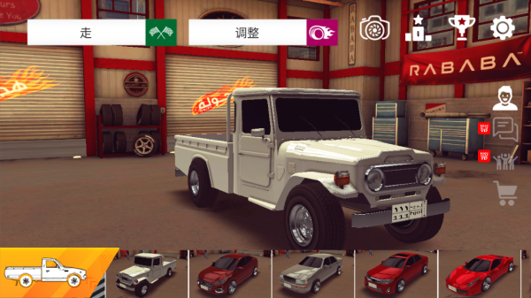 游戏的玩法系统简单的分为两个操作部分,一个就是中文翻译下的“走”和“调整”,其次就是关于车库中车型的选择,其中“走”就是大家常见到的挑战模式,这里分别有“多人”和“单人”模式。