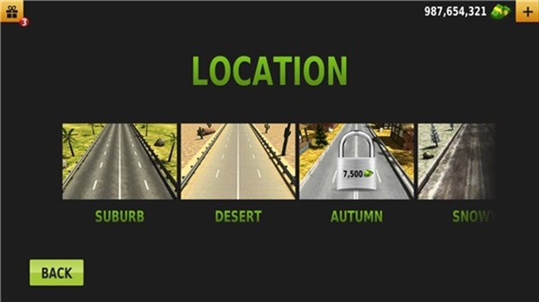 2、以单向无尽模式为例,玩家需先选择赛道,部分赛道需要游戏货币解锁,有些赛道还可提供额外奖励。在城市郊区赛道,操作简单,通过轻触屏幕即可控制油门和刹车,降低了驾驶难度。
