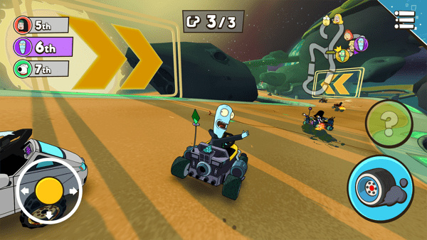 Warped Kart Racers游戏玩法非常简单,在游戏的界面中,左侧是控制赛车变道和飘逸的旋转按钮,右侧是加速按钮,游戏中玩家的目标方向只有一个就是“赢”,在此不论你选择怎样的方式,是炸弹亦或者冲撞,只要你能第一个到达终点你就是赢家。