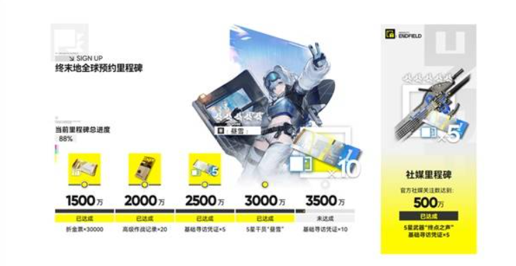 官方社媒关注数达到500万,可获得5星武器“终点之声”、基础寻访凭证x5