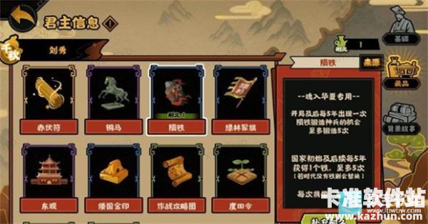 下一个是蓝色消耗型藏品陨铁,开局及后每5年出现一次陨铁锻造神兵的机会,至多锻造5次。同时国家初始及后续每5年获得1个铁,至多5次。这个铁就是用来给你锻造神兵消耗的,当然你也可以留作他用。锻造神兵就是随机给你3把武器选一个,有可能出现金武。本身有武器的情况下就只能用来合成升级,能省下一点升级费用。加上还是消耗型的,总体比较鸡肋。