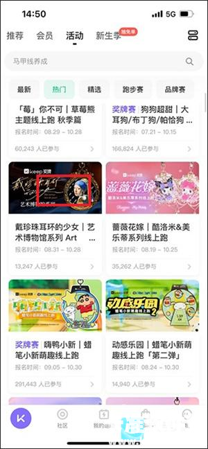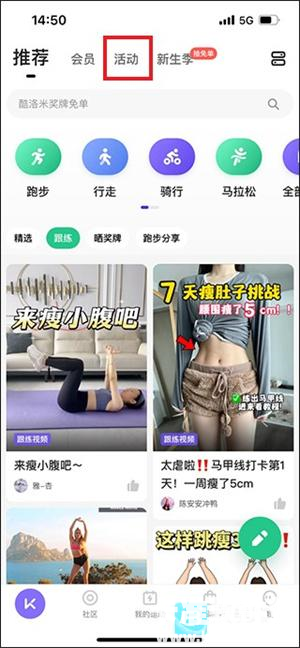 1、打开keep软件,进入用户推荐首页,点击上方导航栏中的“活动”按钮;