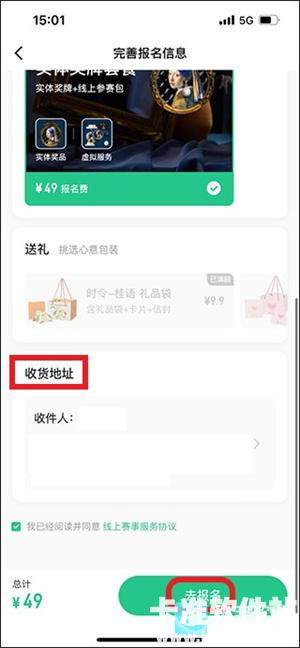4、进入到完善报名信息页面,选择活动时间、活动组别、奖牌套餐以及收获地址信息,勾选下方的“同意协议”按钮,再点击“去报名”按钮;