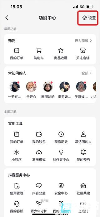 3、进入功能中心,点击右上角的【设置】;