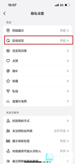 5、进入隐私设置界面,点击【在线状态】选项;