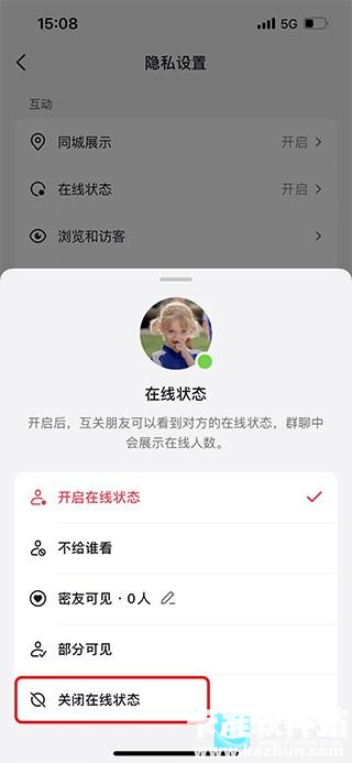 6、最后在弹出的页面当中选择【关闭在线状态】选项即可完成。