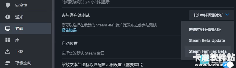 2、在界面中选择Steam Families Beta并重启
