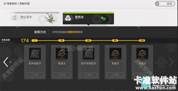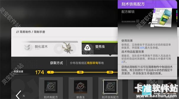 3、可以看到有紫色品质和蓝色品质的复活药(刻术瓶),平时多捡萤壳虫就能解锁
