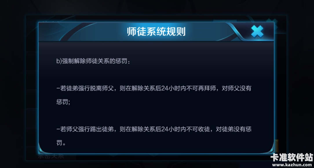 3.解除关系会受到惩罚,徒弟发起的24小时内就不能再拜师;师父发起的不仅24小时不能收徒,通过这个徒弟获得的名师点也会相应减少,实际扣除数=等级*系数。