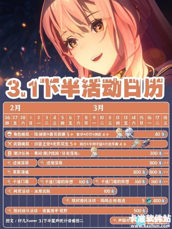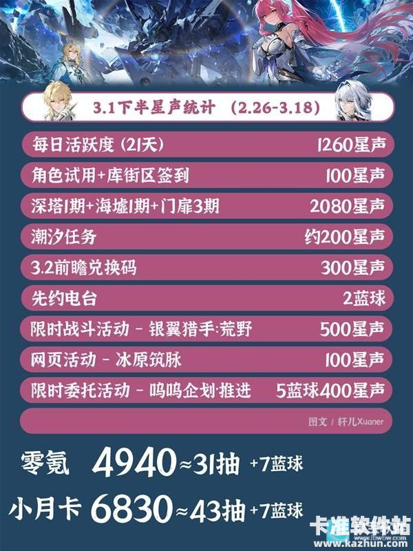 鸣潮3.1下半段期间即将到来!届时会有全新活动上线,玩家可以从中获得大量星声和其他奖励。那么在鸣潮3.1下半部分共有哪些活动呢?下面就跟着灵宝小编来一起看看吧。注意:星声统计请以实际游戏内获得数量为准,下半应该多一些成就的星声,一起算在上半了,记得上线领取1600星声哦~