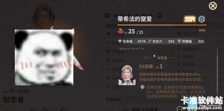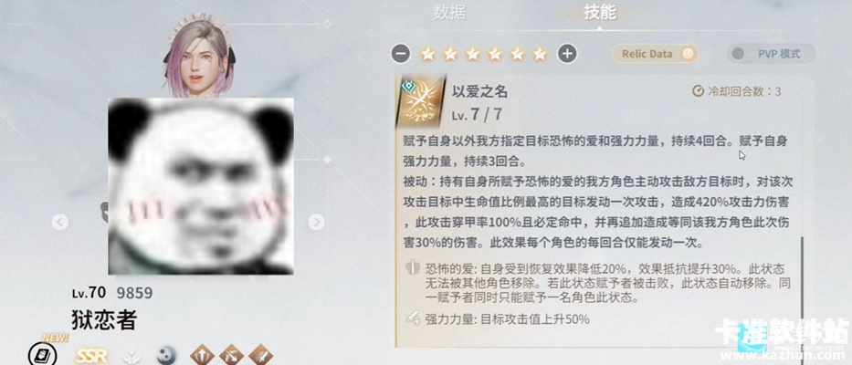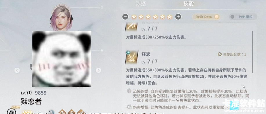 狱恋者PVE用来辅助输出,给输出加攻增伤,且能触发狱恋者真伤追击,伤害也不低。4回合恐怖的爱和强力力量,3回合后究极技冷却结束可刷新状态。 PVE能到T0.5的强度