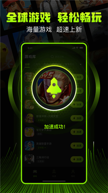 覆盖国内外海量游戏库,全年运维监控,及时同步支持热门新游。LOL手游、吃鸡国际服、王者荣耀等上千款游戏均支持一键开启智能加速!