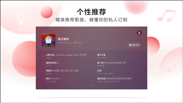 与手机版、电脑版一致,TV版同样享有网易云音乐多达千万首的曲库,囊括百万无损SQ音乐,即时解决大部分电视音乐资源不全等痛点。此外,网易云还对不同年代、曲风、应用场景的曲目进行重新整理分类,便于用户快捷查找。