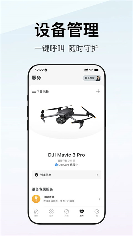 1、记录陪伴,查看设备使用时间和 DJI Care 剩余天数。