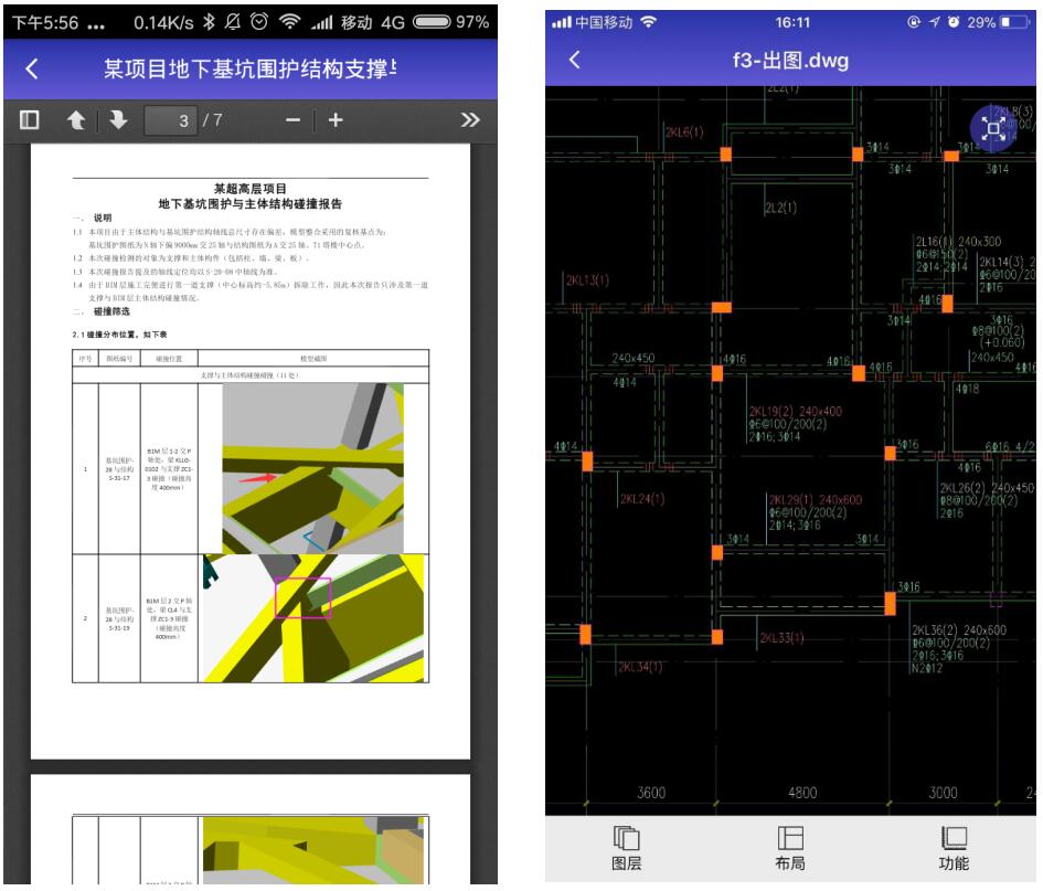 App支持几十种专业格式文件的在线预览全功能检索,快速搜索所需文档,提供浏览、下载、上传、删除权限控制,可针对任一层级文件夹,对组织或成员进行灵活授权管理,资料快速浏览,云端存储安全可靠。并且支持dwg文件在线打开,按照图层查看,可进行简单测量和编辑,为项目人员在特殊环境作业查看文件图纸提供便利。