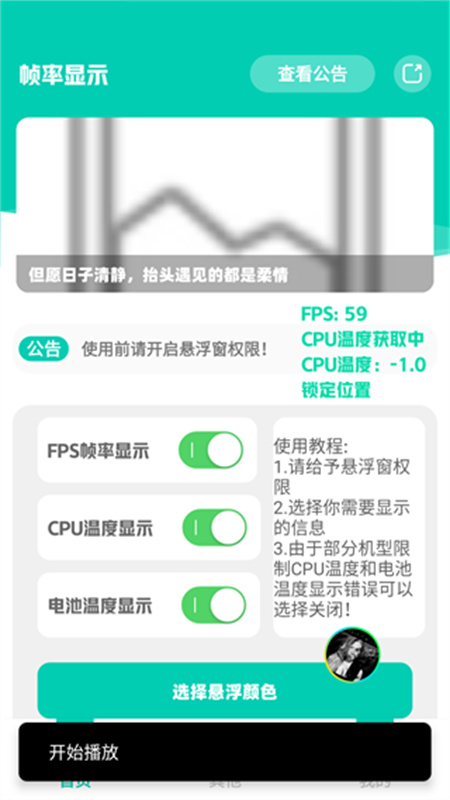 帧率显示器FPS软件是一款非常方便以及实用的帧率显示类型软件,在这款软件之中可以直接的帮助你在打游戏的时候测量自己的帧率实时变化,CPU温度以及电池温度等等一系列的采纳数,时时刻刻的了解到自己的手机情况吧。帧率显示器FPS软件之中还会将你的手机型号以及主板信息等等参数进行一一的展示,就算是你对手机不太熟悉也可以时时刻刻的把握自己的手机情况,非常的方便以及稳定哦。